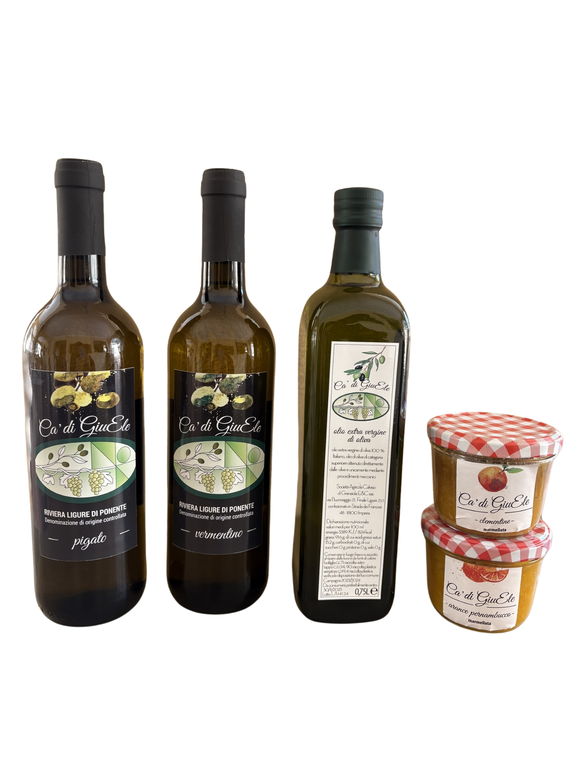 1 Bottiglia di Vermentino, 1 Bottiglia di Pigato, 1 Bottiglia da 0,75lt di olio, 2 marmellate di agrumi